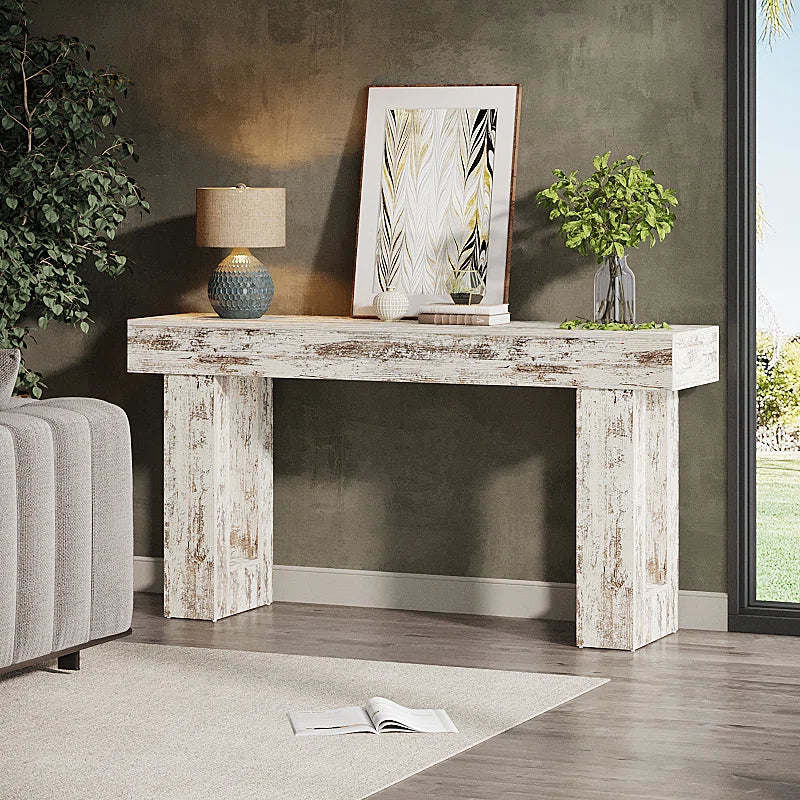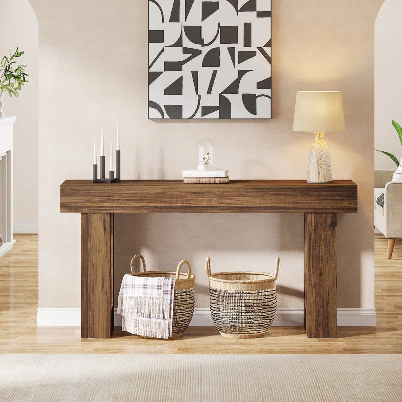 Embrace rustic elegance with our farmhouse-style Entryway Console. Offering a generous 63-inch surface for your decor, its solid MDF construction and wood-like finish ensure long-lasting charm. Stable and secure thanks to foot nails, it gracefully enhances any space - be it your foyer, living room, or hallway. With easy assembly and a one-year quality guarantee, plus lifetime customer service, it's the stylish, reassuring choice for your home.