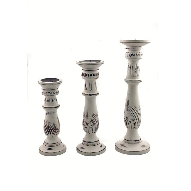 This 3-piece wooden candlestick set gives you just the right place to display your favorite pillar candles. Each round piece is carved from solid mango wood and has a rustic white hue with visible wood grain and purposeful distressing for an antique-inspired look. This set also has turned details that give these pieces a classic candlestick design. They range in size from small (12" tall) to large (18") and look great arranged together on your mantelpiece, or scattered across your dining table. Plus, they each accommodate a candle up to 4" wide.