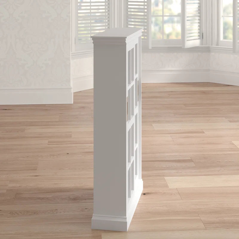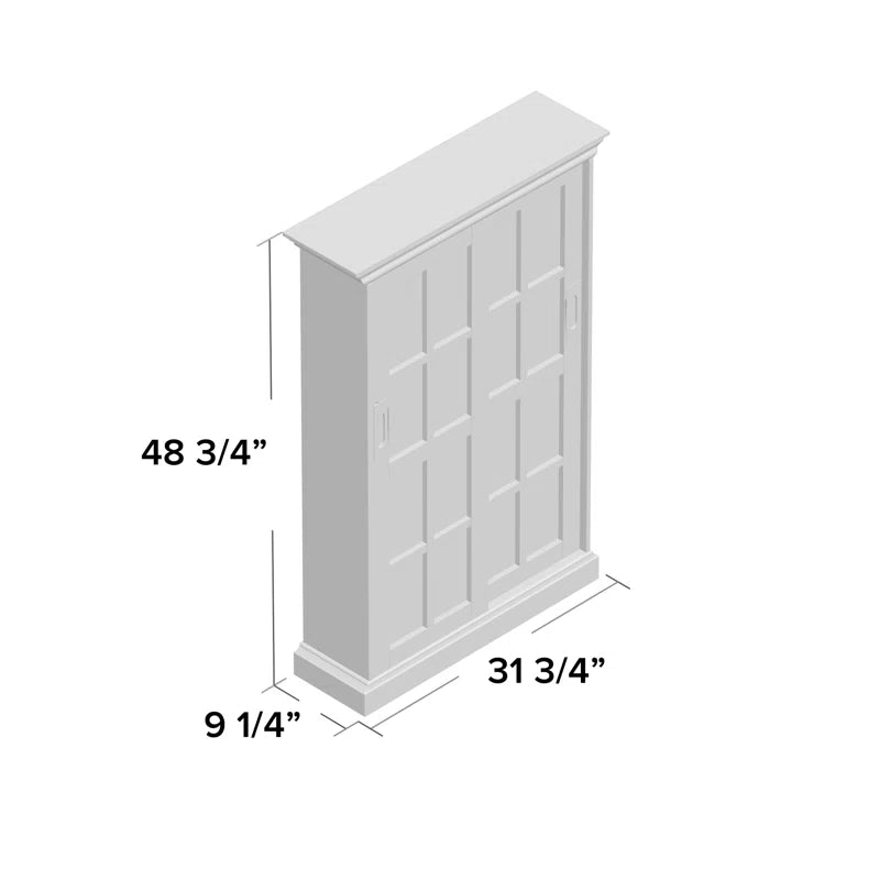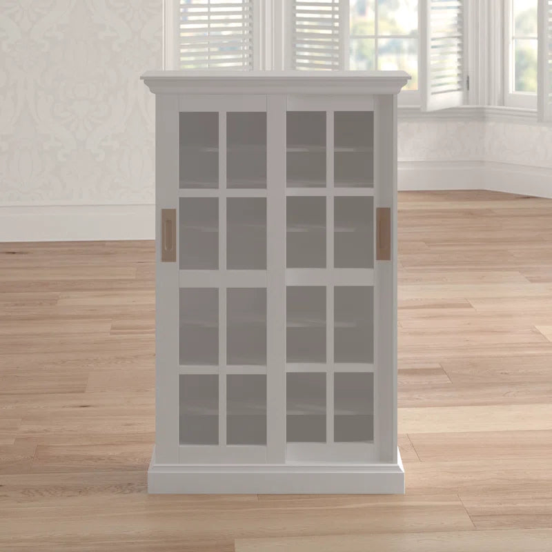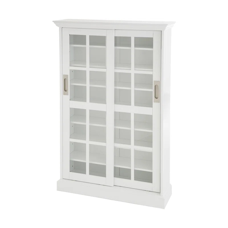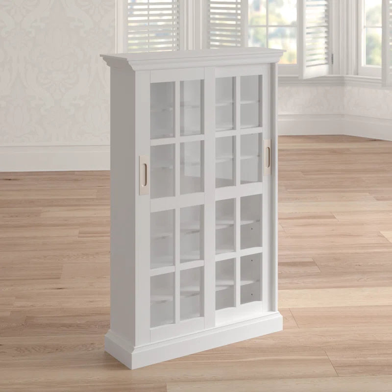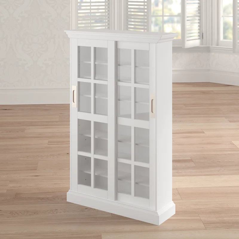 Give your collection of movies or music a place to call home with this clean-lined multimedia cabinet. Crafted from manufactured wood, birch wood, and veneers, this design features two tempered glass doors that provide a peek at five adjustable interior shelves, which can hold up to 536 CDs, 165 DVDs, or 136 VHS tapes. A neutral white finish ensures it’s versatile enough to complement any existing arrangement, while classic molding up top adds a traditional touch. Measuring 48.75'' H x 31.75'' W x 9.25'' D overall, this compact piece is narrow enough to fit in smaller spaces. Assembly is required.