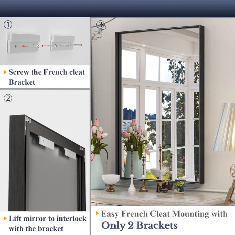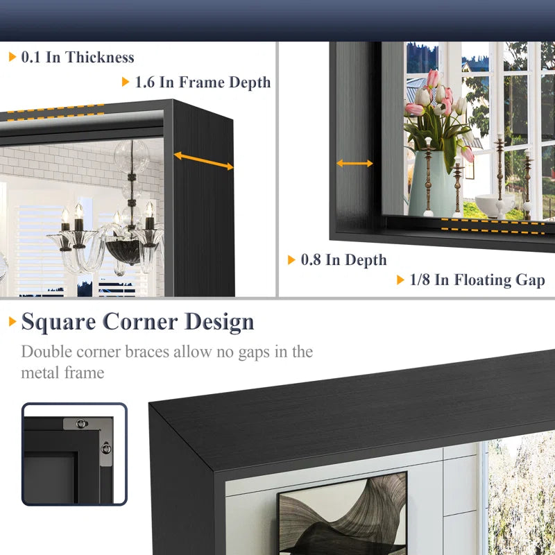A new Interpretation of the classic square corner mirror: Unlike other cheap and flat square corner mirrors, this innovative design allows the glass to float in the middle of the 1.6" metal frame, giving the mirror a more three-dimensional feel. We hope this new design of square corner mirrors will be beyond classic and add a sense of luxury to your room.